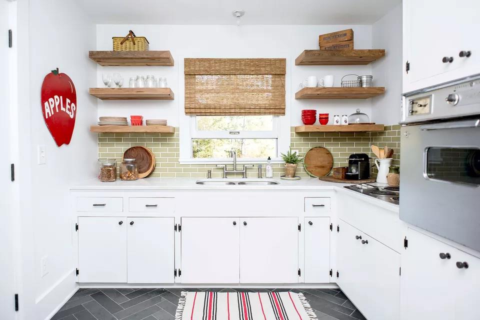 This affordable kitchen design by Alys Design out of Pittsboro, North Carolina, will surely give your white kitchen a splash of country. The white cabinets with black hardware will make you feel refreshed and your cooking space will feel like both rustic and relaxed. A red vintage apple sign will personalize your space. The wooden shelves will give your space a modern farmhouse look.